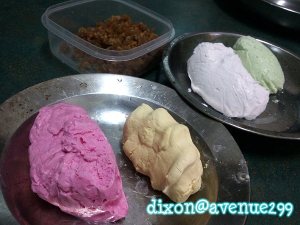 Now get all the ingredients ready – colourful glutinous rice flour dough + ‘gula melaka’