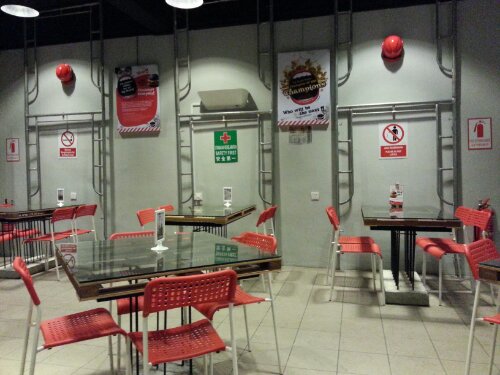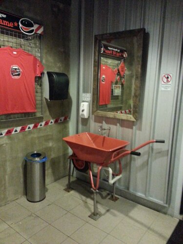 The interior design and ambience are definitely interesting. A lot of steel bars, screws and heavy duty pilings. And a red construction wagon built in as a basin. I liked this idea.