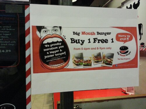 Apparently the first restaurant was this new fast food outlet called, Big Mouth Burger. We jumped in and ordered. To our surprise, they are running a Buy 1 Free 1 promotion. Hahaha! I’m loving it. I think the one up there decided to give us some discounts on dinner spending for believing in him.