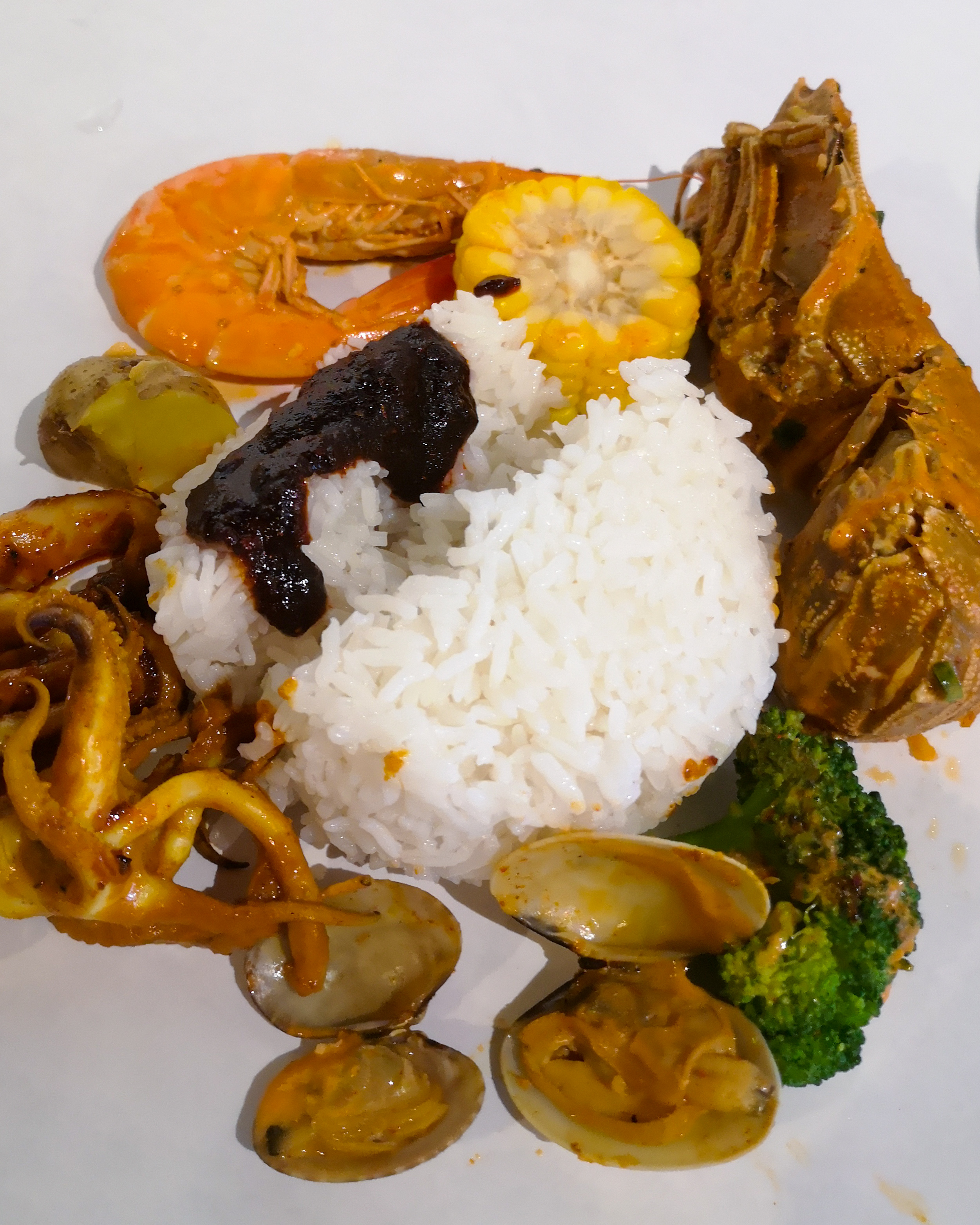 Ingredients: Crab XL (1/2 nos), Fresh Prawn XL, Squid, Broccoli, Corn and Rice