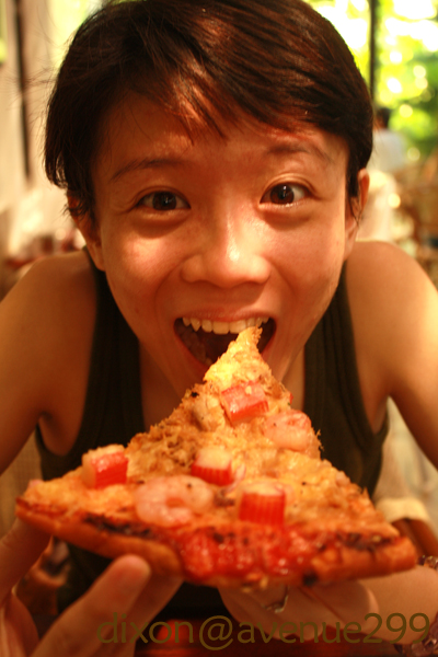 Mein enjoying her big slice of Seafood Pizza. It can be reheated at a reheat counter at the restaurant.