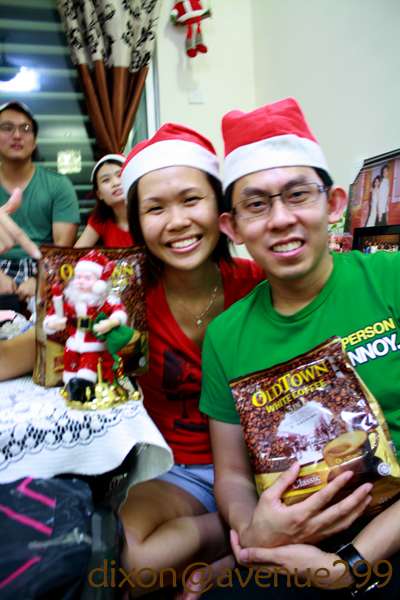 Mey Jian with her blinking Santa, Dennie with his Old Town white coffee…